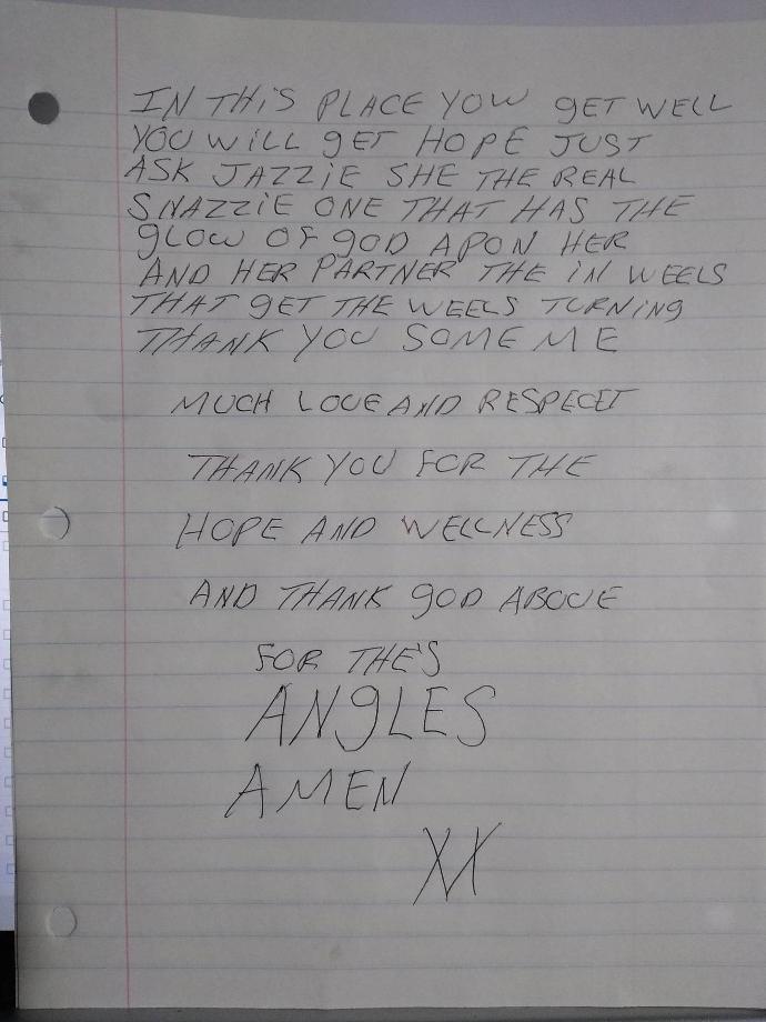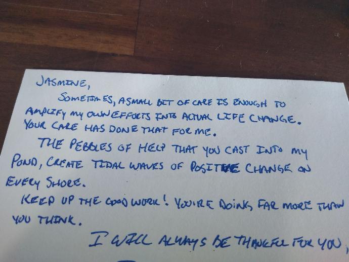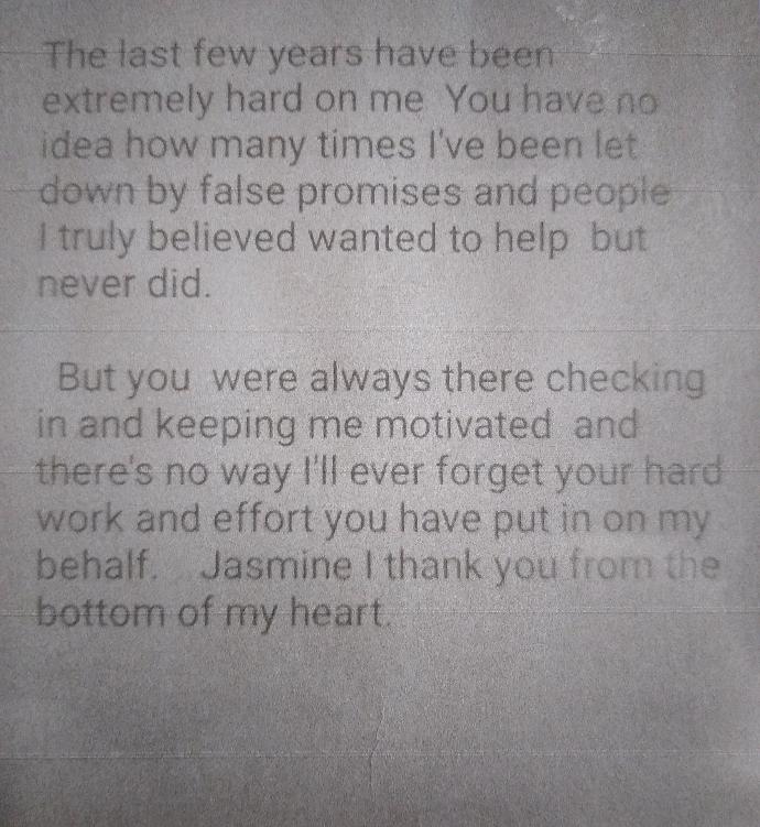 "The last few years have been extremely hard on me. You have no idea how many times I've been let down by false promises and people i truly believed wanted to help but never did. But you were always there checking in and keeping me motivated and there is no way ill ever forget your hard work and effort you have put in on my behalf. Jasmine i thank you from the bottom of my heart."