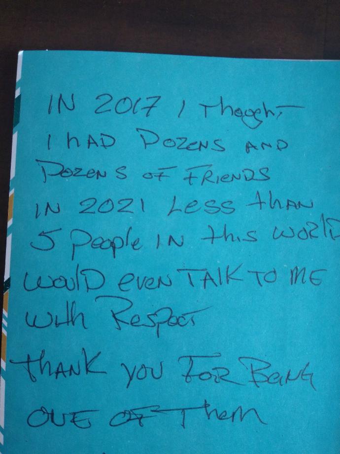"In 2017 i thought iI had dozens and dozens of friends in 2021 less than 5 people in the world would even talk to me with respect......Thank you for being one of them"
