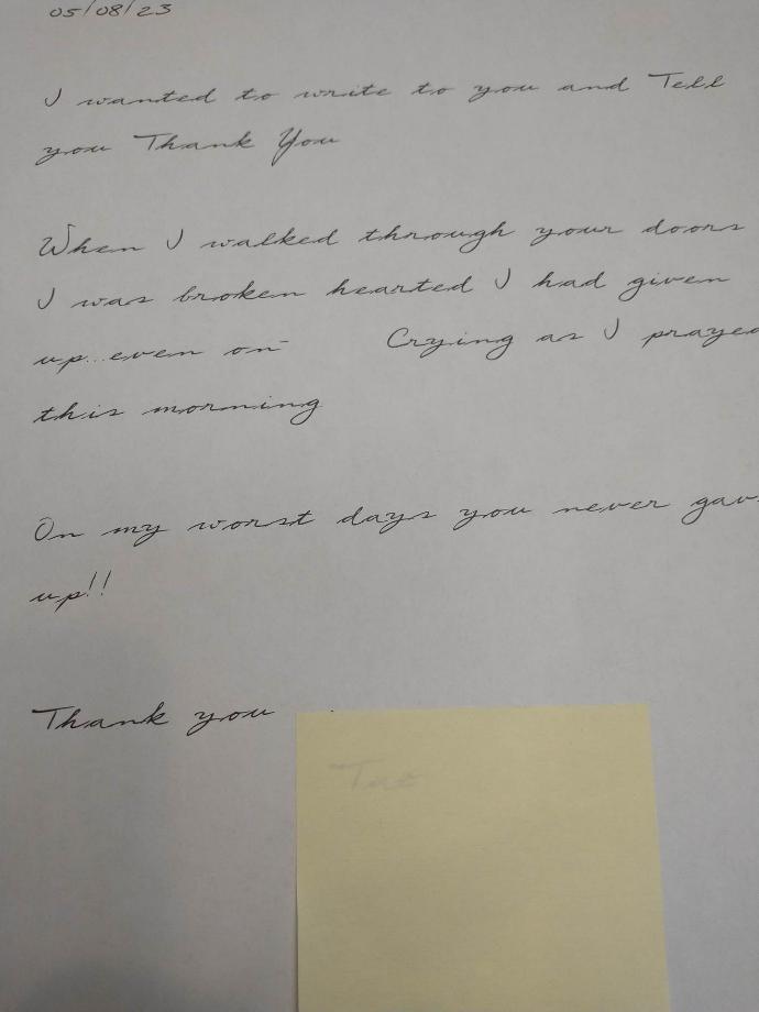 I wanted to write you and tell you thank you...When I walked though your doors, I was brokenhearted I had given up, even now I am crying as praying this morning.